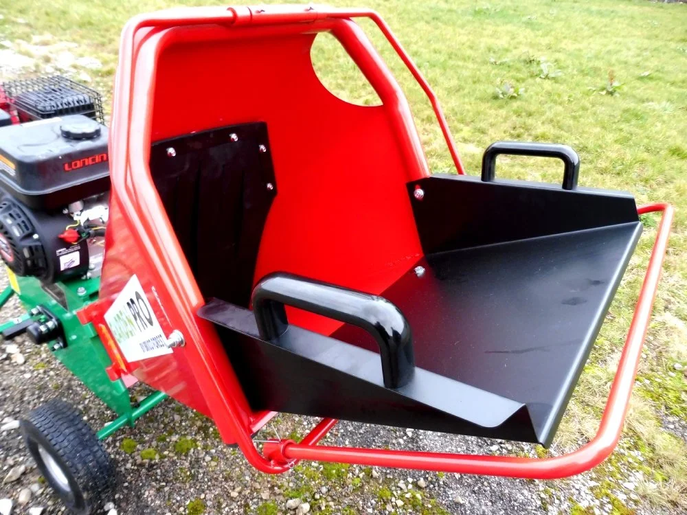 Broyeur de végétaux équipé d’une seule et unique trémie de grande capacité pouvant recevoir des branches sans au préalable effectuer de tri contrairement aux broyeurs à deux trémies.